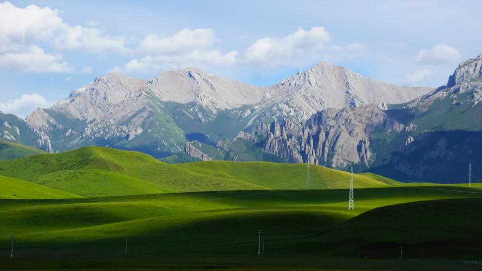 拍于若尔盖境内,那上面有很多人为电线杆和它融为一体,下午的阳光照射在曼杂山上,照出它的心胸宽广