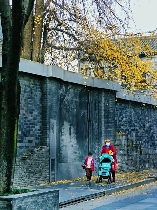 宽窄巷子,银杏黄了。祖孙两人,一路走着,手里握着银杏叶。