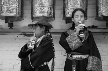 两个藏族女孩在转经筒前手拿纸杯喝水。