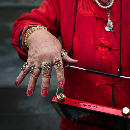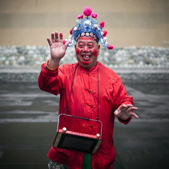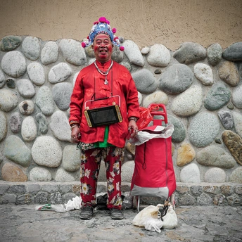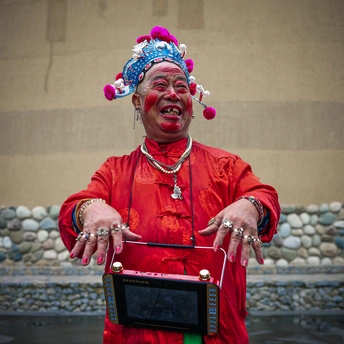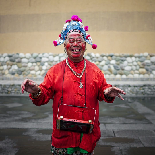 在洛带古镇入口,一名浓妆艳抹的怪老头随着音乐翩翩起舞。他名叫谢庆贵,今年79岁,随身携带的有他引以为傲的草药,住在洛带公社保盛大队五队,退休前是赤脚医生,现在的退休工资3600元。当我询问周围的人,他们都说他是疯子、癫子。也许每个村庄都有一个像“树先生”的人存在,他们心地善良,不争名逐利,乐于助人。这些“傻子”的模样旁人看到不可理喻,但是我却能理解,他们生活在自己的世界中怡然自得。作为“守村人”,他们也是时代的见证。