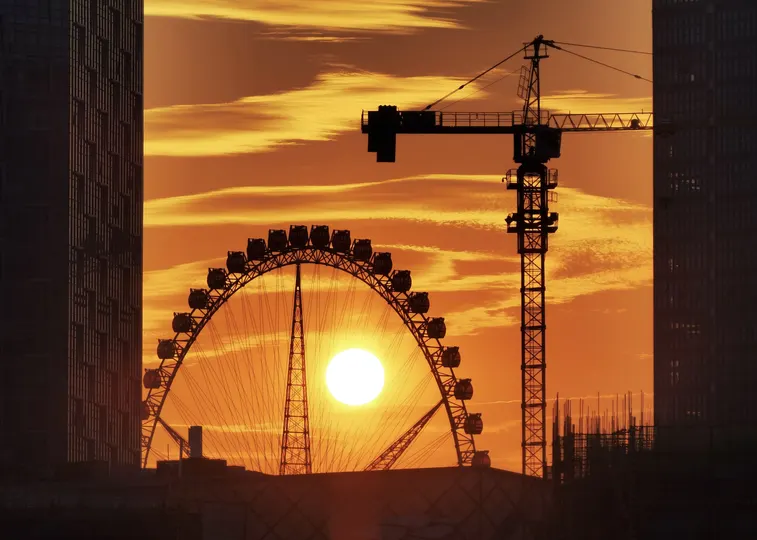 落日时分,摩天轮与塔吊的剪影在余晖中交错,像一幅美丽的画卷。摩天轮的彩灯亮起,与塔吊的灯光相互辉映,营造出一片梦幻的氛围。