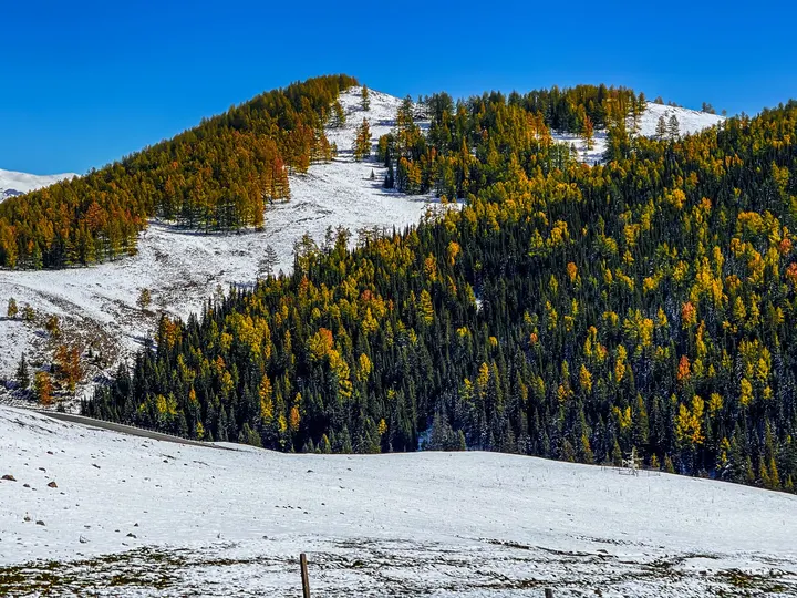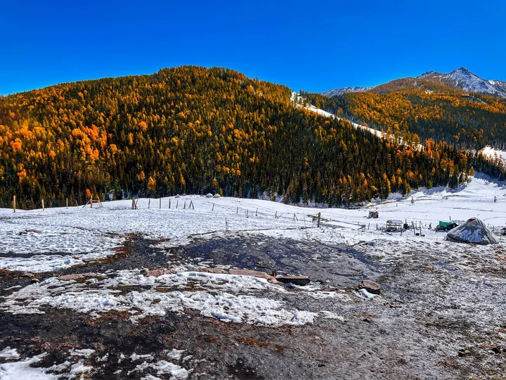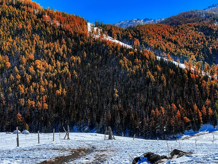 沿着852县道走近禾木,一片冰清玉洁,满山秋林尽染。