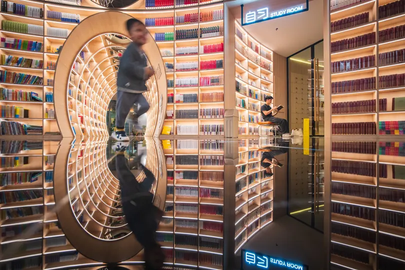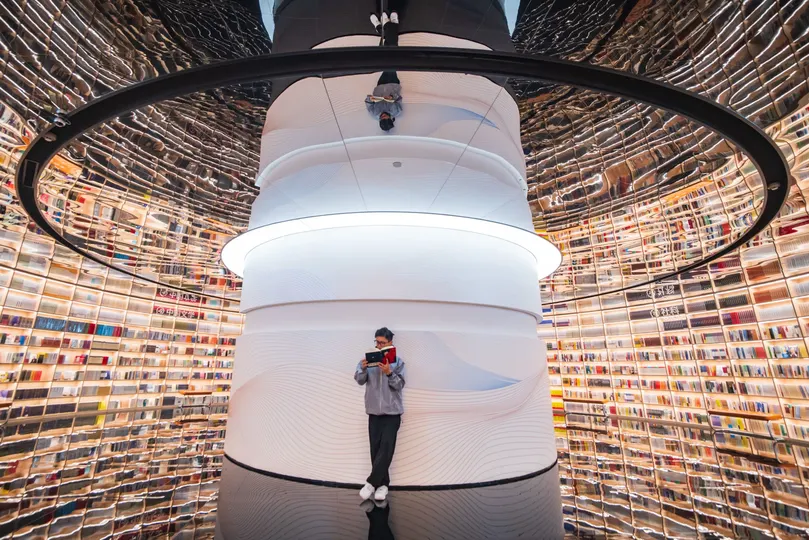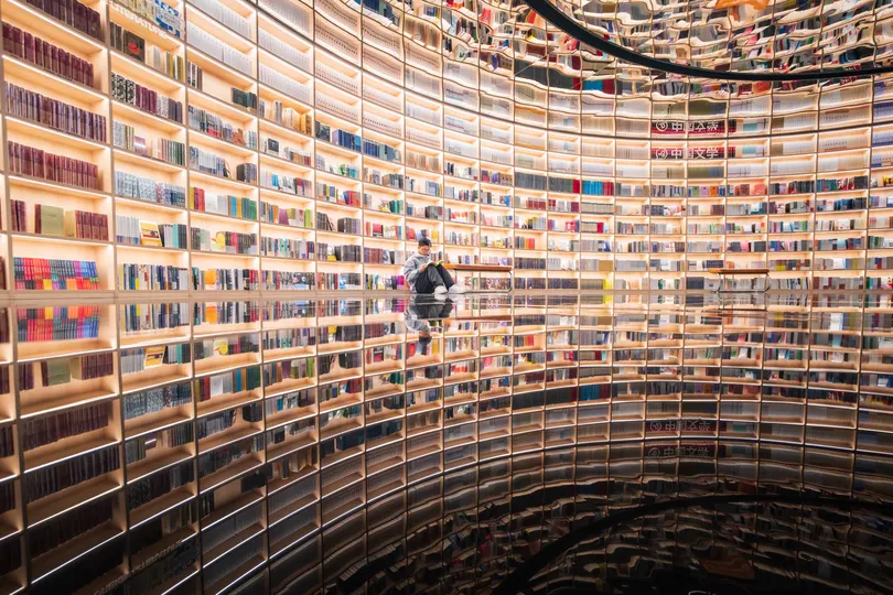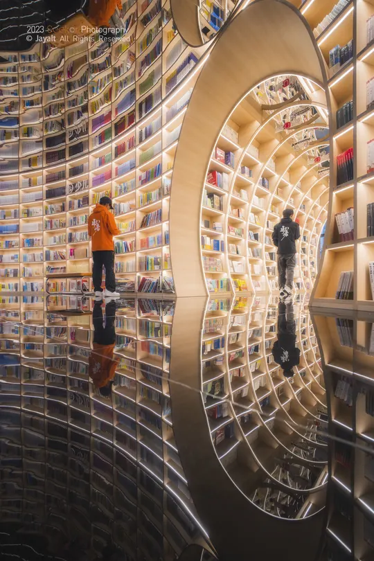 深圳愈欣书店,深圳书墙的天花板,进入书店,第一感觉就是这真的是一个书店吗。地板和顶棚反射的设计让整个书店更具立体感,给人一种仿佛置身与盗梦空间的感觉。@米拍编少 @米拍社长 @米拍小助手 @米拍活动呆呆兽 @米拍