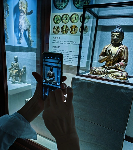 东林寺收藏的明代的大漆贴金木雕佛像 。