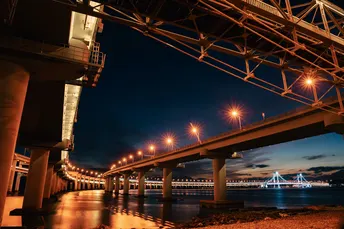 跨海大桥之下有一个在寒风中瑟瑟发抖的我,跨海大桥之上有令人神往的落日余晖。