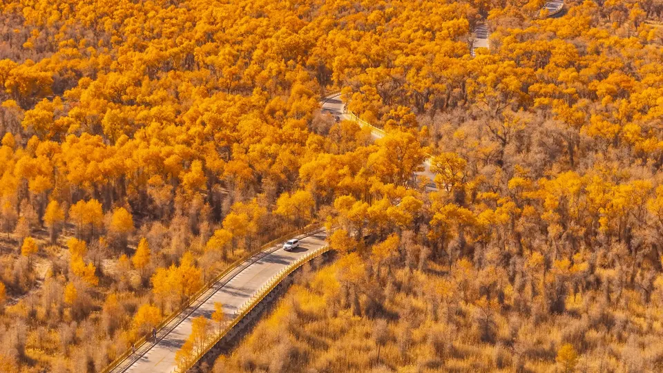 当秋天来临,被一整片胡杨林覆盖,穿梭于其中,美不胜收。