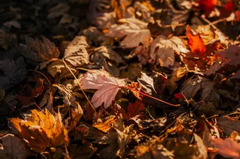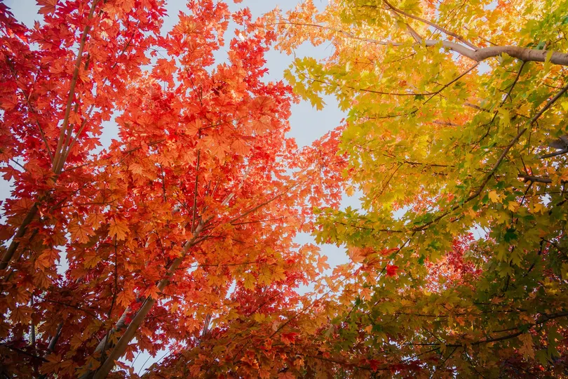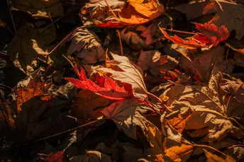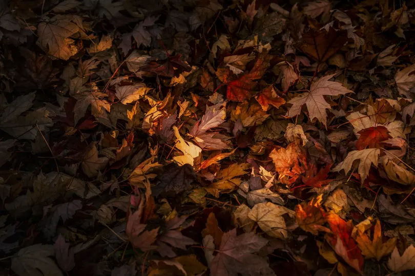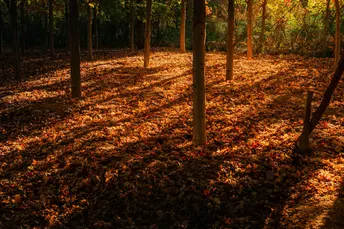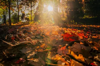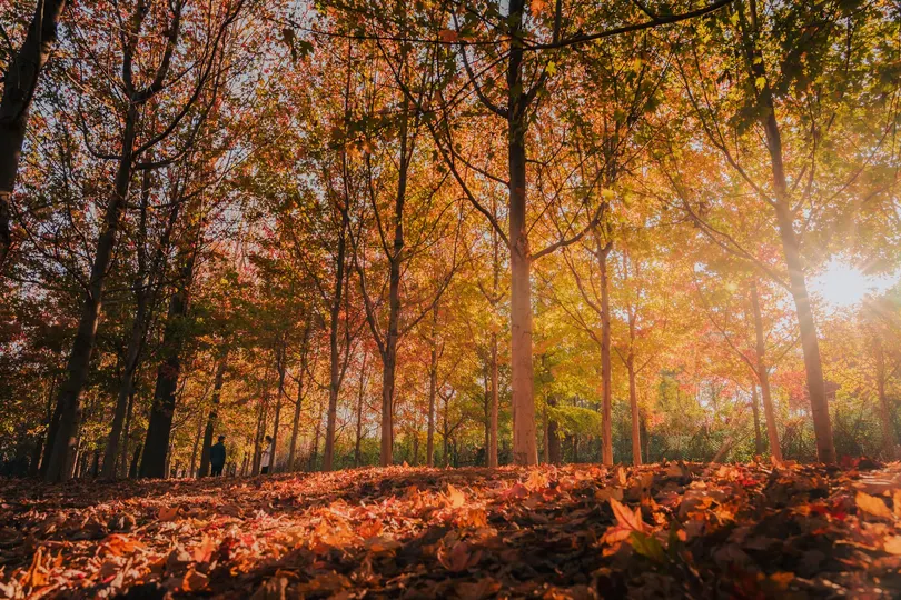 秋日林间洒下的光线配上红叶勾勒出一幅优美的秋日画卷。