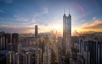 夕阳下的地王大厦,曾经的深圳地标性建筑,如今已被平安大厦所顶替,但依旧挡不住它标志性的造型