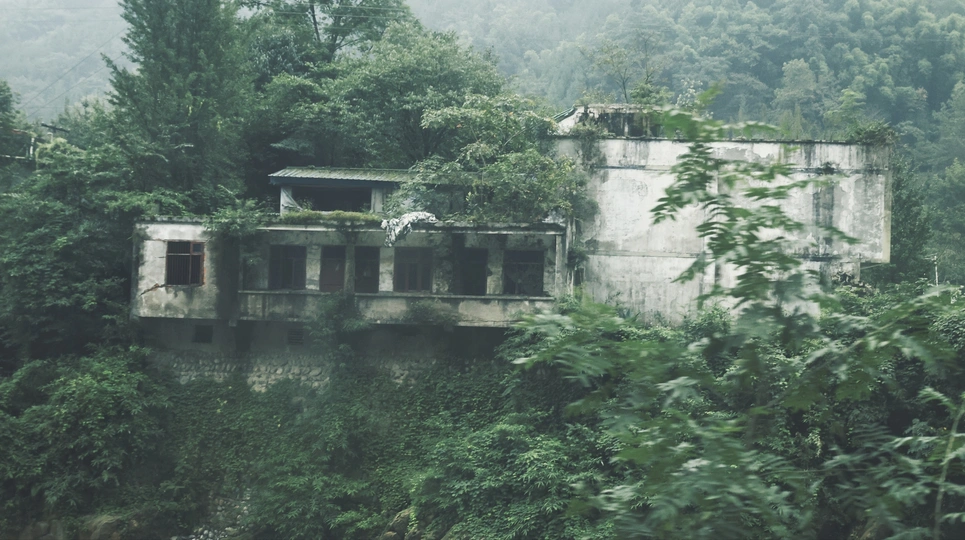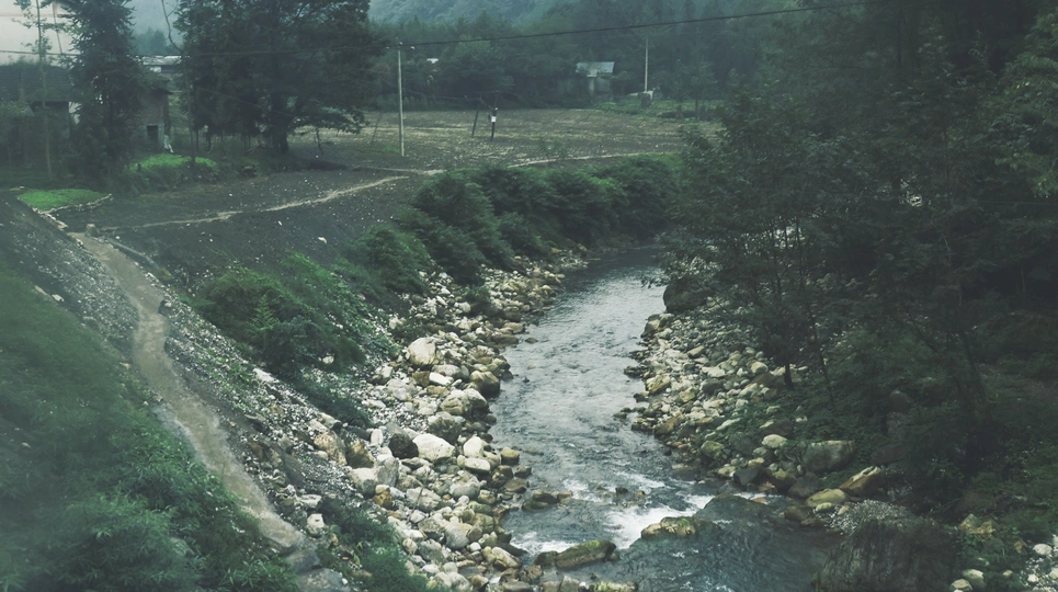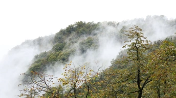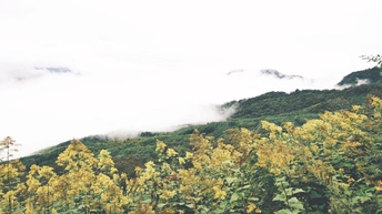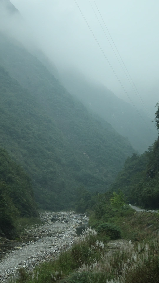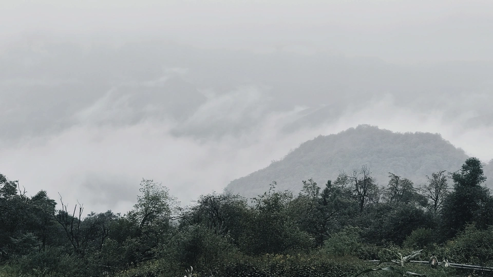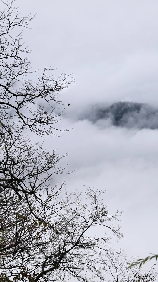 桂花香从微微开着的天窗挤进来,香气装满整个车厢。一路上青涩的柿子和沉淀淀的柚子都围在马路两边观摩初来乍到的人们。从山脚出发,再也看不见瓦蓝的水流,木桥和栈道。那便开始真正的进山。五个小时的徒步陪伴我们的是淅淅沥沥的小雨飘摇,和陌生的同路人,他们站在缓缓赶来的身后、歇脚的台阶、山路中间横着的大树旁,慷慨的递来他们的光亮,为彼此加油。山腰,断断续续的信号接通,大家都抹一把发梢的雨水开始打通第一个电话。山路旁盘满蛛网的野花,云雾缭绕的山林,闻着空气中弥漫泥土的清香,嘴里叼上牛奶继续往前,越往高走,树开始没有树叶,跟记忆里北方街道的树大差不差,没有一点摇曳。直到看见红旗,终于。