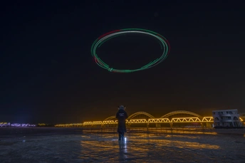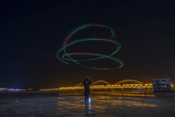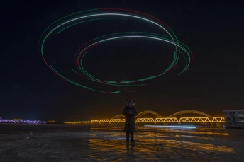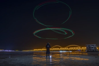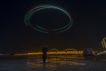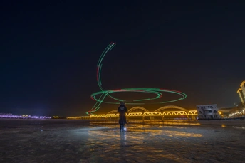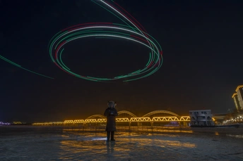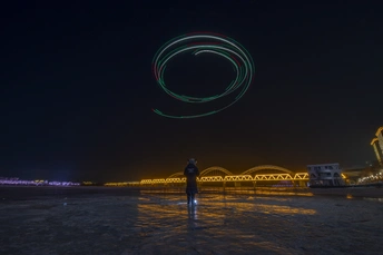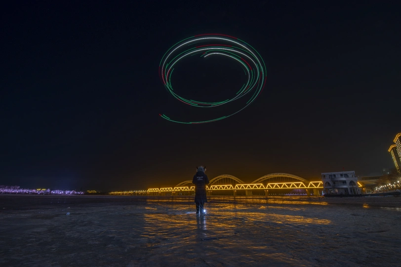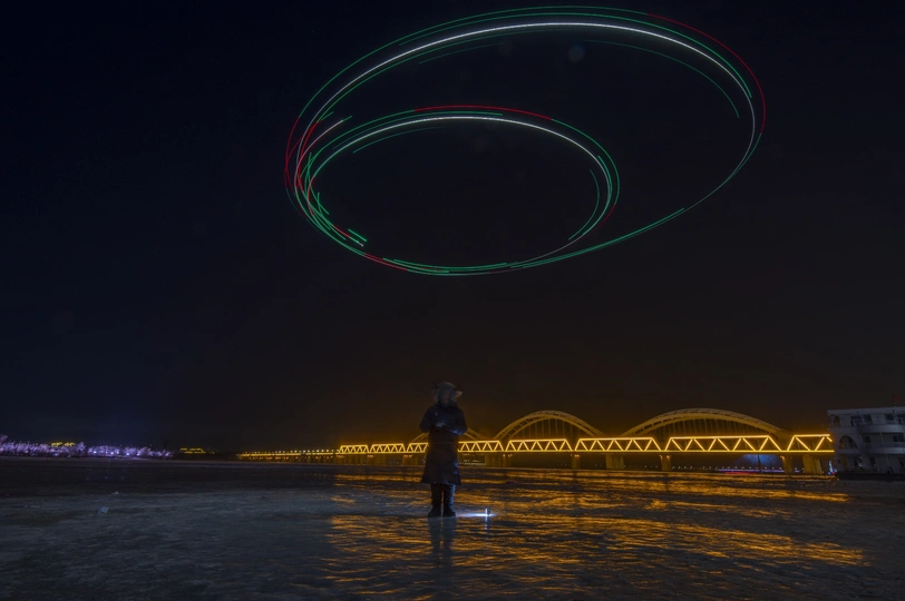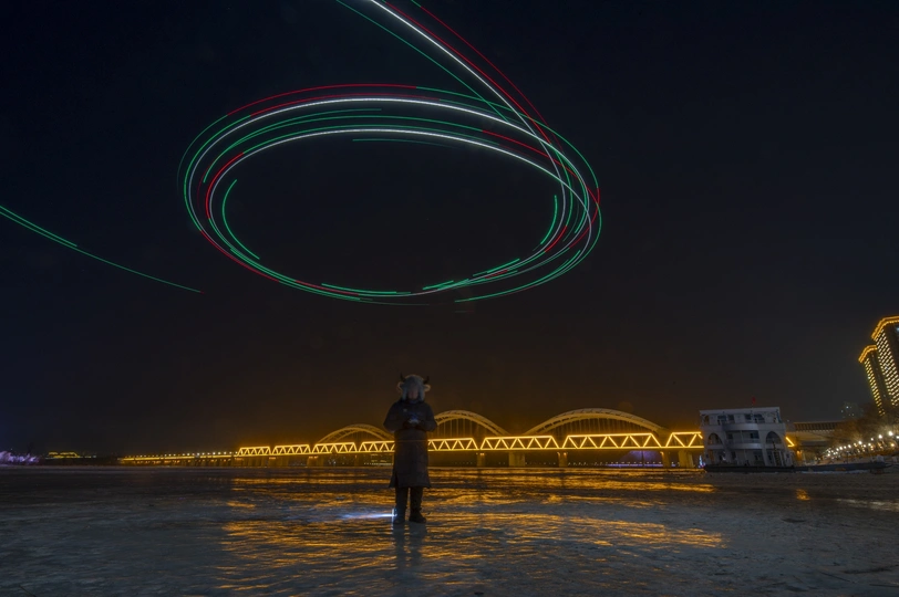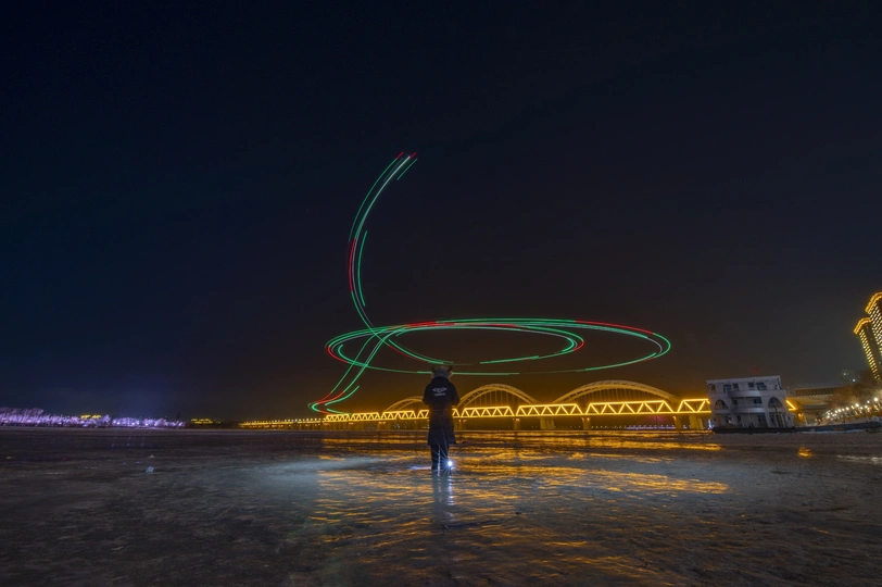 哈尔滨的冬天就是冷,在松花江上,为了拍这组照片,镜头回去都结冰了。这个背景是松花江铁路桥。很多影视剧的取景地
