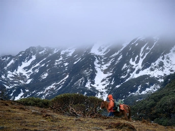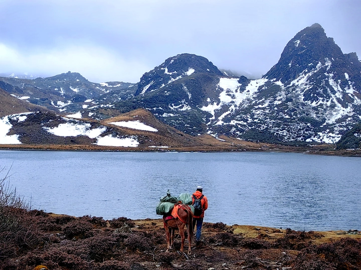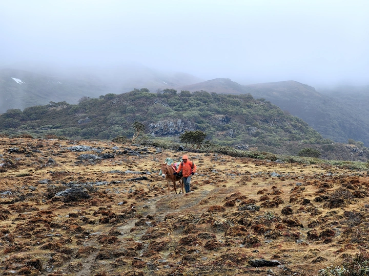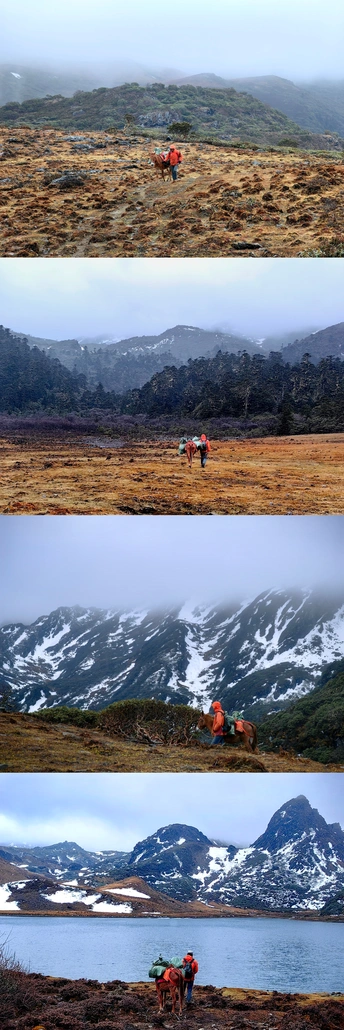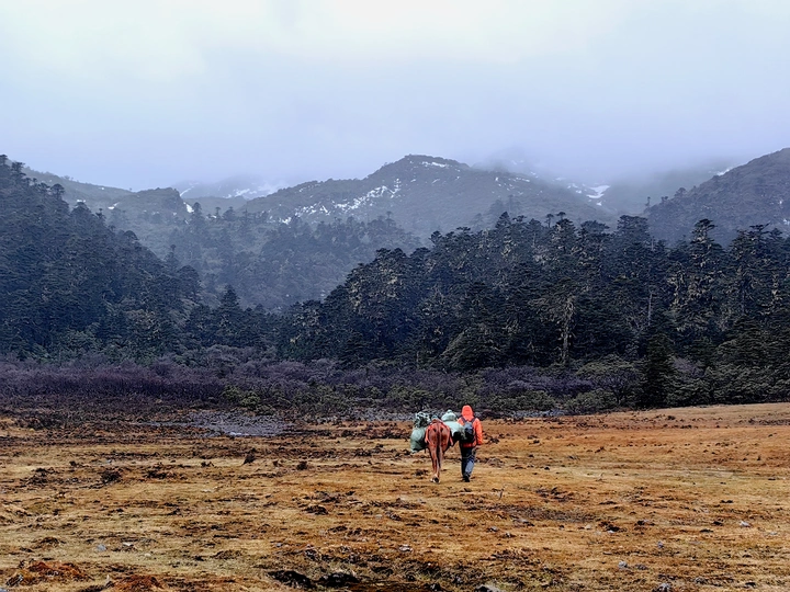藏区徒步,免不了需要找当地的向导,阴冷的天气下,向导和他的马匹,更显孤寂。