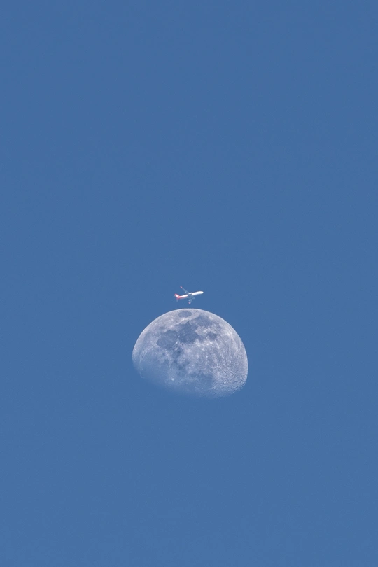 一个月亮孤独地悬挂在空中,一架飞机孤独地飞过它的上方,它们永远不会有交集,因为实际上相隔万里