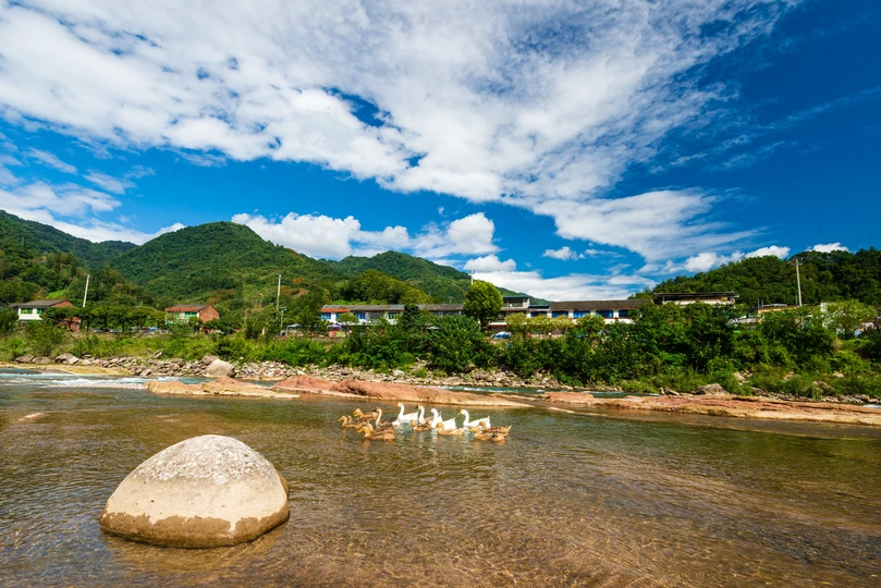 成都大邑出江,绿水青山,一群鸭子和鹅游弋江中,好一派田园风光