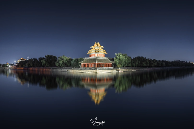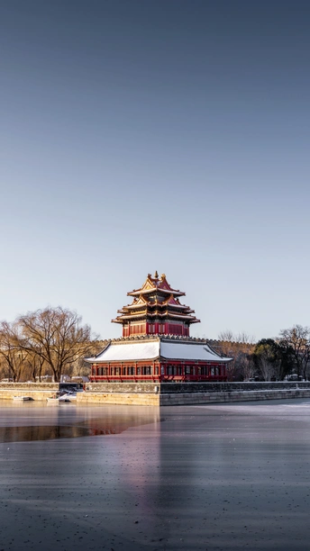 紫禁城角楼位于北京市东城区,是一座四面凸字形平面组合的多角建筑,屋顶有三层,上层是纵横搭交的歇山顶,由两坡流水的悬山顶与四面坡的庑殿组合而成,因这种屋顶上有九条主要屋脊,所以称做九脊殿。中层采用勾连搭的做法,用四面抱厦的歇山顶环拱中心的屋顶,犹如众星拱月。下层檐为一环半坡顶的腰檐,使上两层的5个屋顶形成一个复合式的整体。集精巧的建筑结构和精湛的建筑艺术于一身,由于角楼的各部分比例协调,檐角秀丽,造型玲珑别致,成为紫禁城的标志,使人惊奇,赞叹与敬仰。
