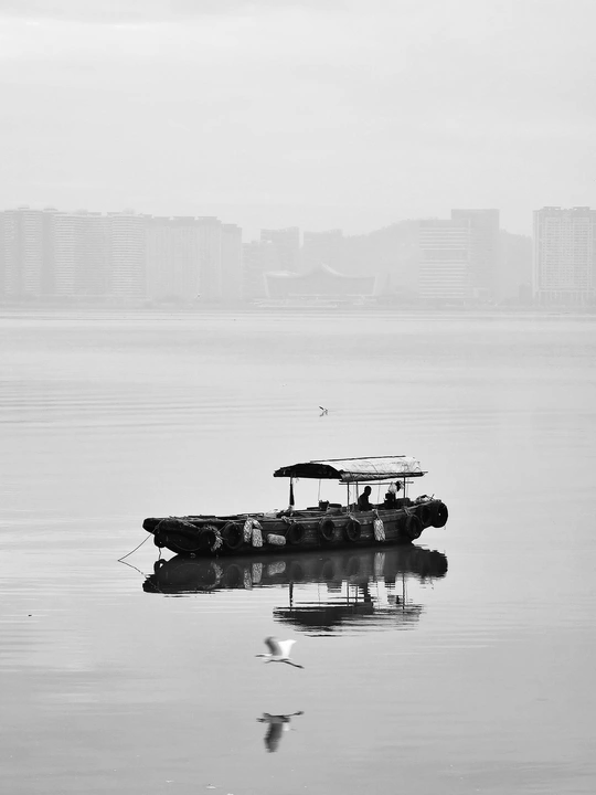 雾天的内海湾,南滨蒙上了薄纱,依稀可见。一渔船泊在浅滩处,海鸟在水面飞旋。