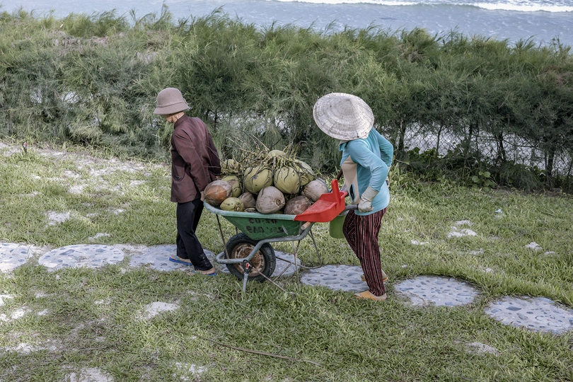 我喜欢海边,有时候看着大妈一前一后用独轮车搬运刚摘的椰子都觉得很好看