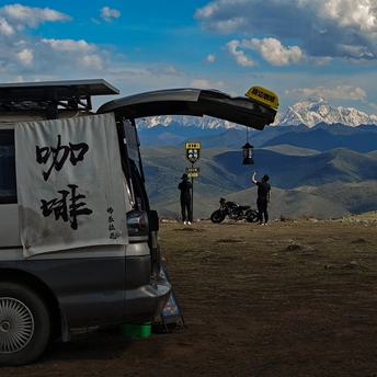 摄于天空之城,卖咖啡的小车挂了个小灯,正好后面有人在拍风景。
