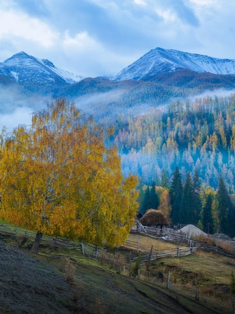 新疆白哈巴村中,晨雾飘扬在秋日的斑斓彩林中。一场夜雪,远处的阿尔泰山白了它的山头,而近处的那一株树是如此的灿烂和盛大。