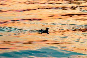 晚霞红进波光粼粼的湖面, 湖面浮动着金色光芒的波纹,仿佛是金箔上的褶皱一般。 西湖鸳鸯悠闲游荡期中,一幅浮光跃金,沐浴金汤。