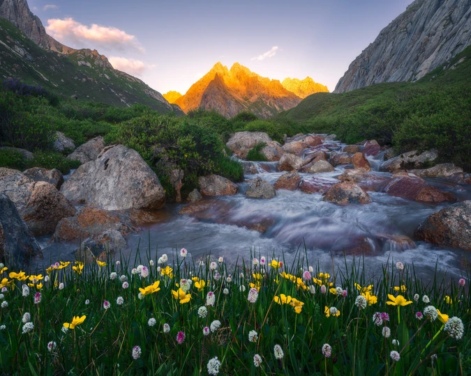 在短暂的夏季里,原本荒芜冷峻的年保玉则终于恢复了一些生机。依靠夏日丰沛的降水和冰川融水,年保玉则山区内充满了各种河流和溪流,以及到处盛开的野花。日落的光线把年保玉则嶙峋光秃的石峰照成金色,在溪流中的一个小岛上,各色的野花密如繁星。