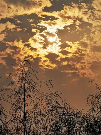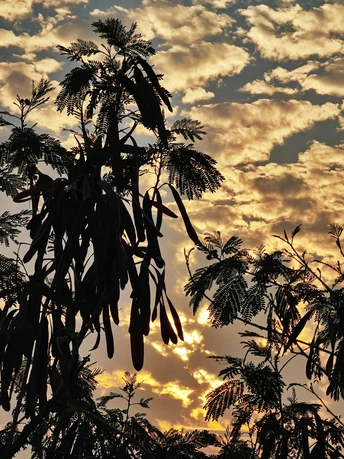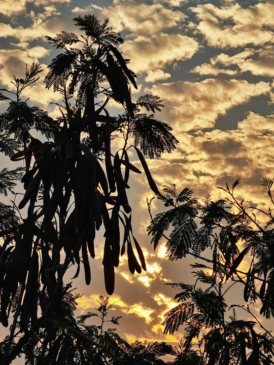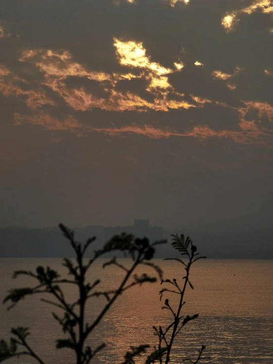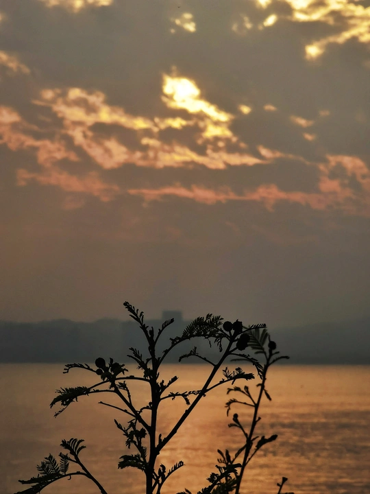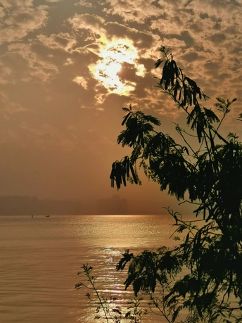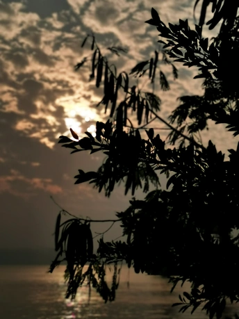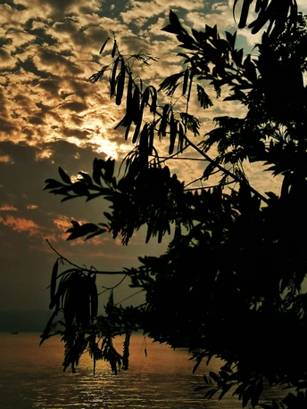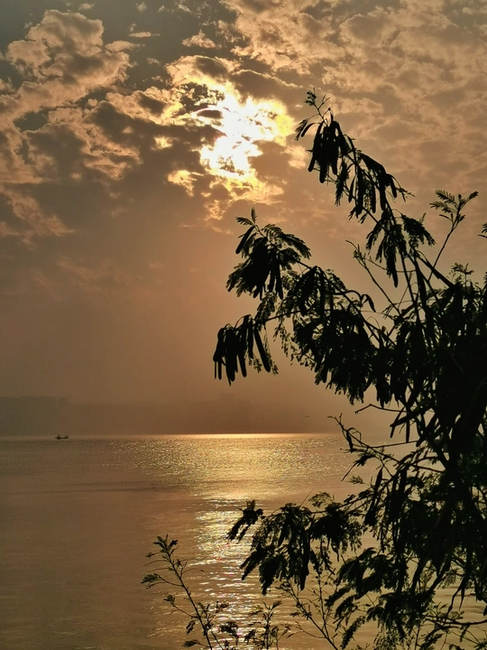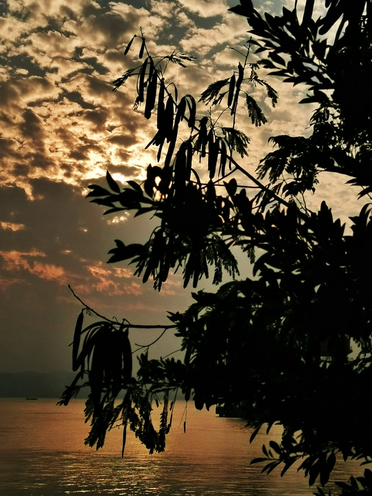 夕阳西斜,角度较低,内海湾岸边长有树木,这样就可以逆光拍摄剪影。