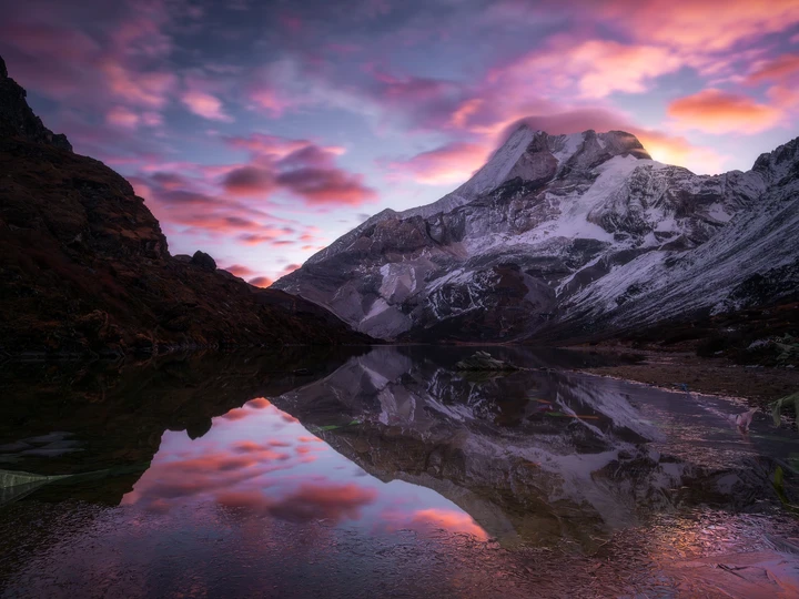 从蛇湖这一侧看到的央迈勇雪山(海拔6033米)的西侧的山形,和从洛绒牛场看到的它的东侧的山形迥然不同,如果说东侧的它身型俊俏,那么西侧的它就有点魁梧粗壮。 清晨,日出之前,天空中布满了紫红色的火烧云,如同棉絮一般。央迈勇的冰川和积雪也被染上了淡淡的紫粉色,使得它就像火焰中的一块冰。