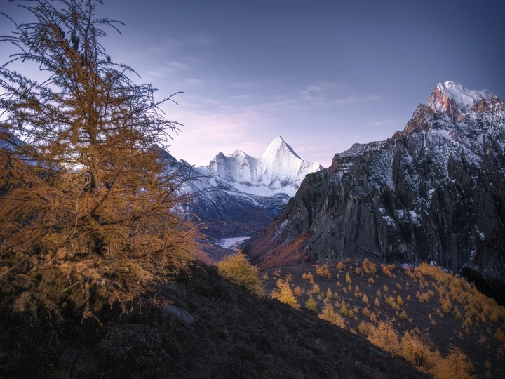 深秋,亚丁景区内,通往洛绒牛场、直面央迈勇雪山的山谷已是一片金黄,这满山遍野的红杉林已是它们一年中最斑斓的时刻。央迈勇雪山(画面中间,海拔6033米)的山头已被日出前最后的一缕霞光照亮,而画面右侧那庞大的山体就是仙乃日雪山(海拔5998米)。