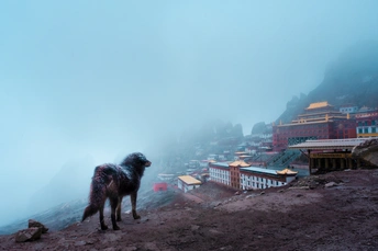 海拔4800米,孜珠寺门外,一只远眺孜珠寺的藏獒,虽然已经是5月,但是温度却是零下,天空中飘着的雪花,将藏獒的的背上落白。