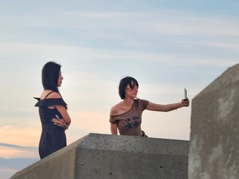 两位美女在汕头东海岸堤坝上,背靠天空和大海,拍下美丽的瞬间。