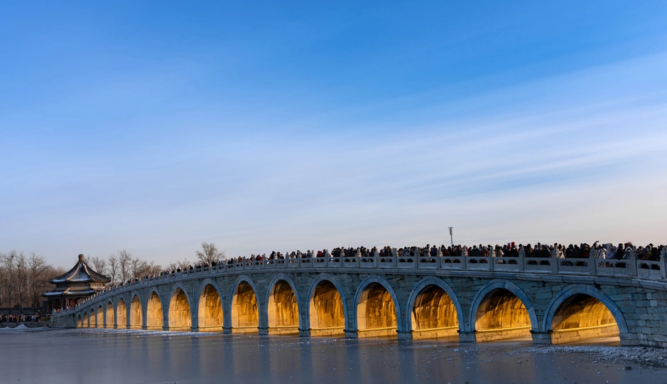 北京颐和园被誉为“皇家园林博物馆”,也是保存最完整的一座皇家行宫御苑。园中最大的石桥十七孔桥,始建于清乾隆十五年。每年冬至前后,十七孔桥在冬至前后会呈现红光穿桥洞的奇景。