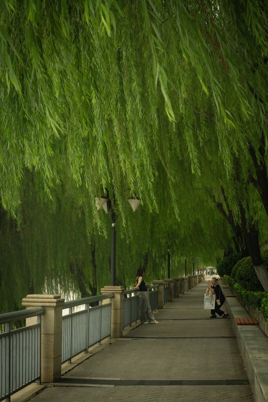 武汉汉江江滩风光带,柳树郁郁葱葱,景色甚是宜人。一对母女正在拍照留念。