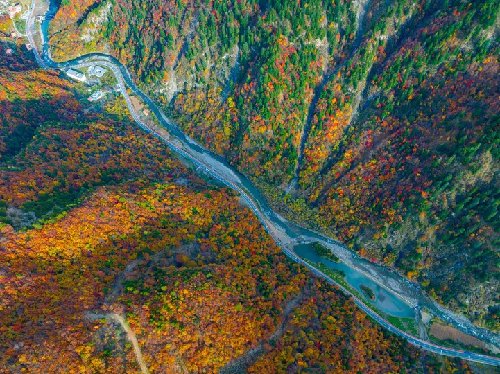河流从彩林中间穿行而过,将绚丽图画分割出裂痕,那是光进来的地方。
