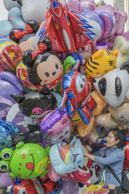成都东郊记忆,大姐微笑着整理各种各样出售的动漫气球,付出努力也收获一份美好。