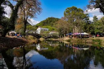 在温暖的阳光下,一座石拱桥静静地横跨在河流上,桥上车水马龙,人来人往。桥下的河水清澈见底,缓缓流淌,仿佛在诉说着古老的故事。桥旁的绿树和青草随风摇曳,散发出清新的气息。河对面的古老建筑,屋顶覆盖着黄色的瓦片,与周围的景色相映成趣。整个画面充满了中国传统文化的气息,让人仿佛穿越到了那个遥远而美丽的时代。
