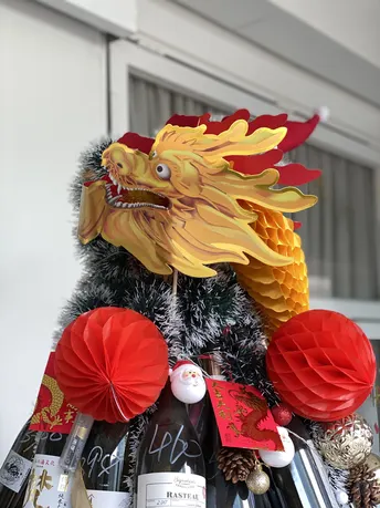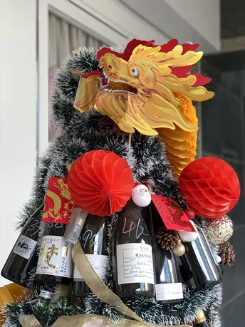 单位院子里有一家餐馆,门外用饮料瓶子做成一棵圣诞树。圣诞节过了也没拆除,这不,春节到来就又在圣诞树上盘了一条龙。看起来倒也结合的很完美。 其实,外国的圣诞节和中国的春节,有些习俗是很像的。比如家人团聚,一起吃大餐。中国人是给孩子红包,外国人是给孩子礼物。中国人是自己放鞭炮和烟花。外国人是管理机构放礼花(不让个人放)……
