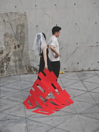 一对男女站立着,大大的囍字非常醒目,他们似乎在思考着什么,也许是关于未来的生活,也许是关于彼此的爱情,也许是关于即将到来的婚礼。