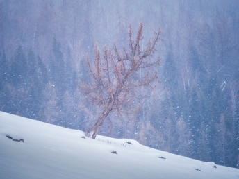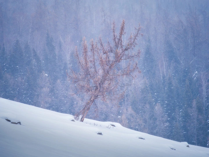 中国新疆最西北的、靠近中国-哈萨克斯坦边境的小村落“白哈巴”村中的一株奇特的枯树,像是浑身长满了金色的绒毛,孤独地、斜斜地矗立在冬日积雪的山坡上。