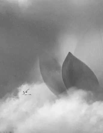骑鹤仙人在云雾中遇见似山似荷花的巨大物体