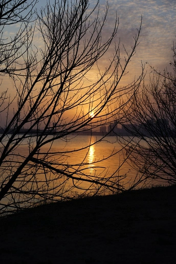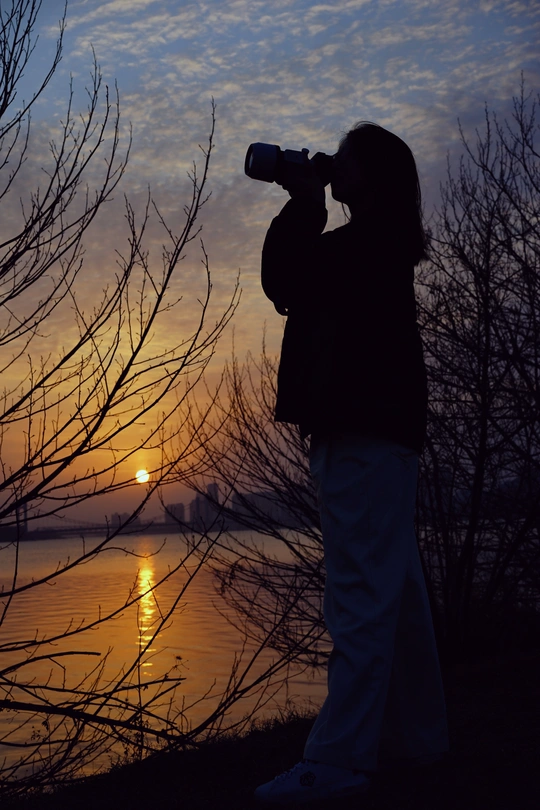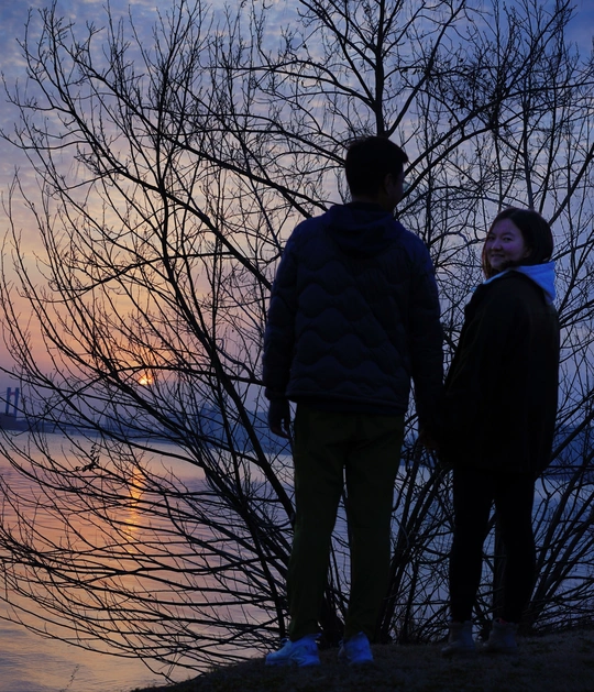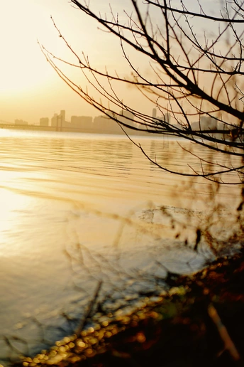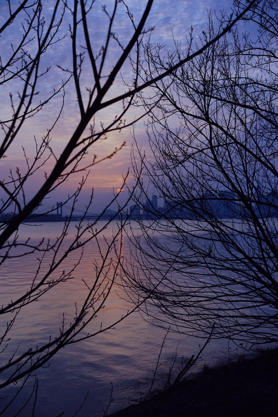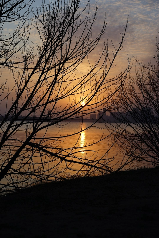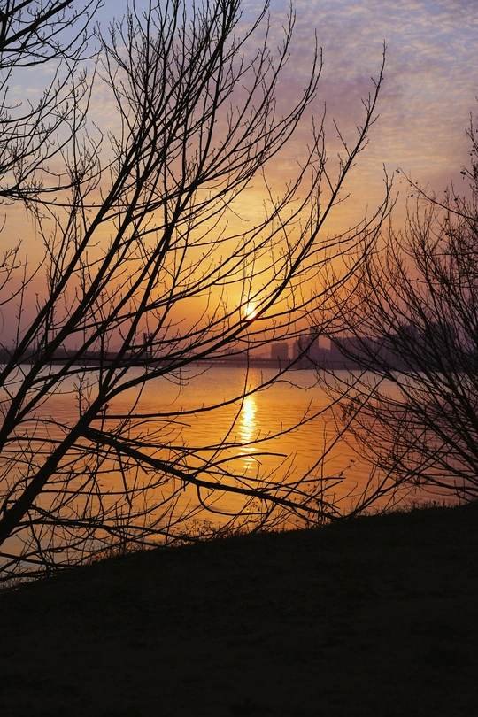 冬日里偶然捕捉的一次日落。微风和蔼,树影窈窕,宽阔的汉江有如一面硕大而光滑的镜子,在夕阳余辉的照耀下,闪烁着金色的光辉。落日如诗,美得让人忍不住感叹大自然的无穷魅力;亦如一副油画,那高级的渐变配色让人陶醉…