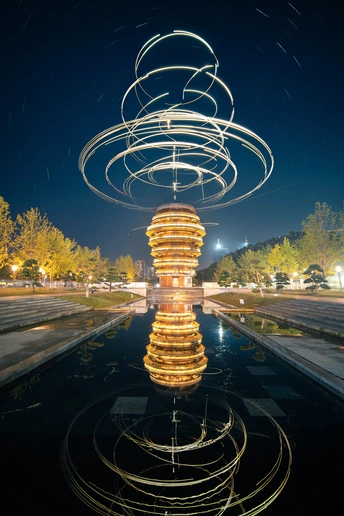 使用无人机补光灯对云楼环绕光绘,在配合相机长时间曝光,记录下贵阳云楼在星空和水面倒影中,另一个空间中魔幻的云楼形态。