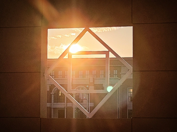 毕业后又一次重回母校, 落日夕阳透过墙壁上的砖瓦照射在操场上, 真是一副美丽的夕阳落日图。