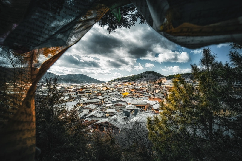 在独克宗古城里旅游时,发现了一个独特视角,飘起的经幡与树枝做框架式构图。