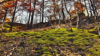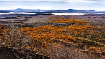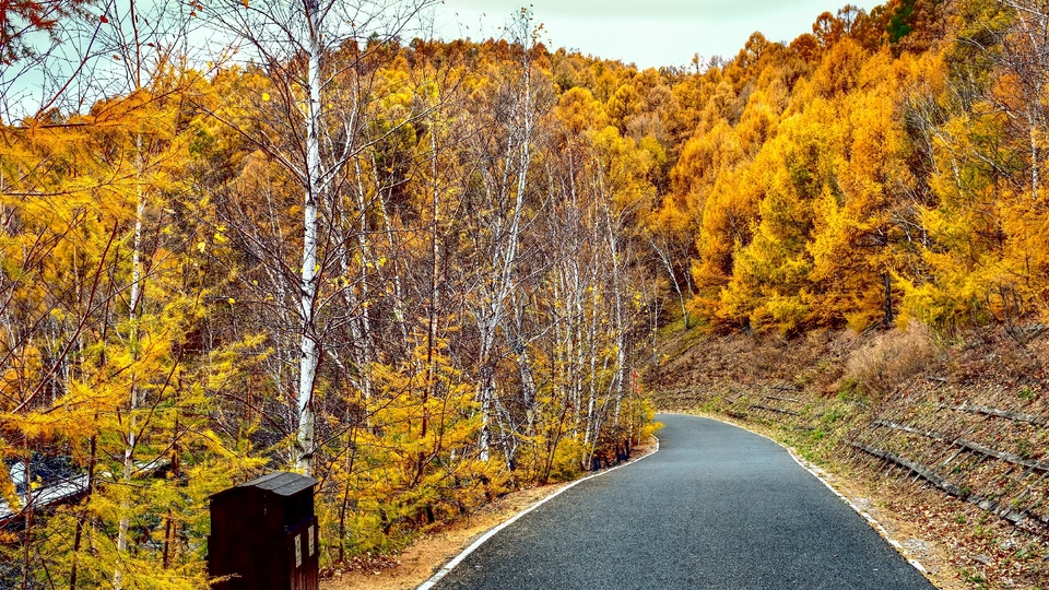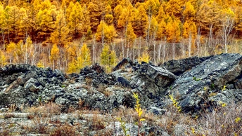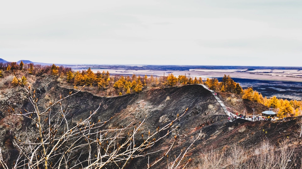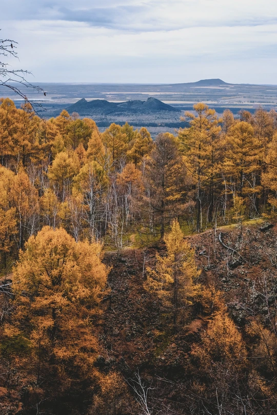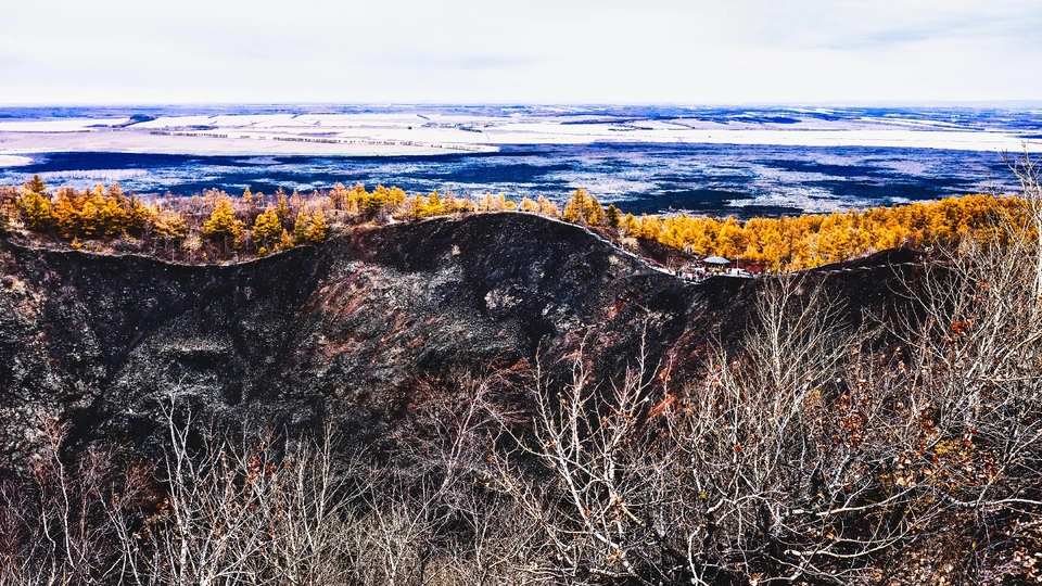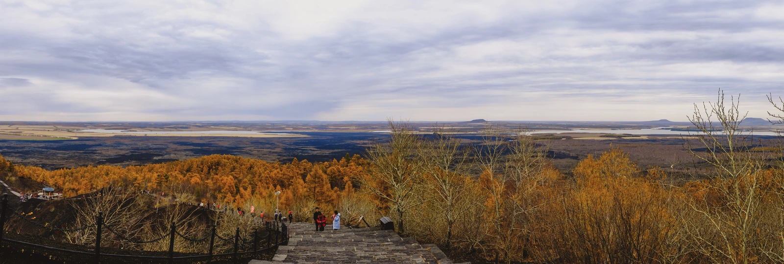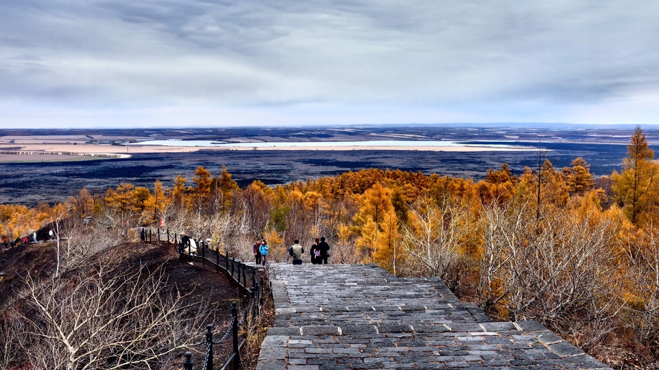 五大连池的秋天,黑色的火山灰加上金色的秋叶,自然而然地形成了黑金这种风格的色彩。
