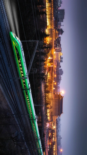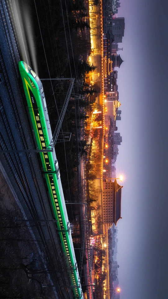 西安北门城墙下的火车