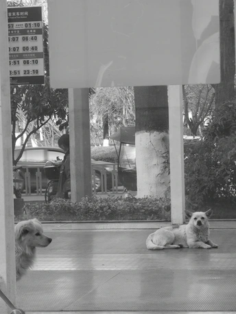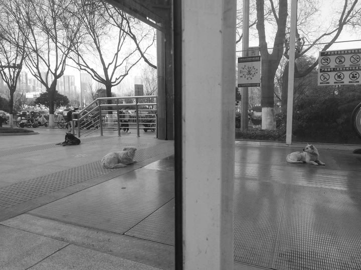 地铁口有三只狗 一直在周围徘徊不愿意离去 一只白色的狗好似跟主人走丢了 走进地铁口后 就静静的趴卧在那里 时而注视着来往的行人 另外一只白狗一直陪在不远处 始终保持着不远的距离 似乎是守护着它 黑狗忽而跑到外面 沿着地铁口周围转圈 边跑边回头 再转回地铁口 停在在不远处张望 黑狗来来回回转了几圈后 也静静的趴卧下来 陪着两只白狗等待