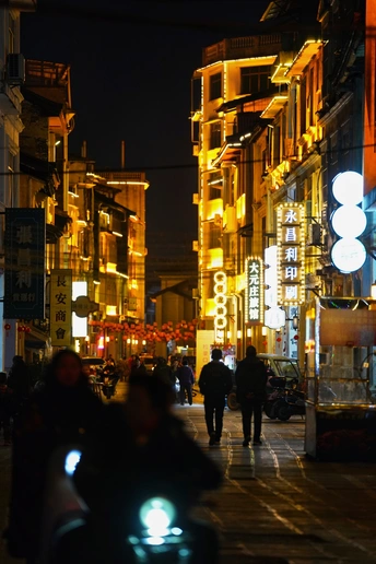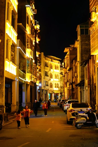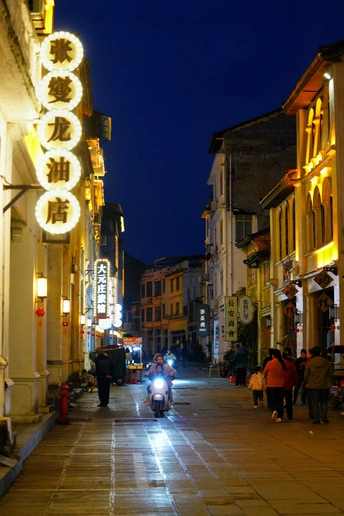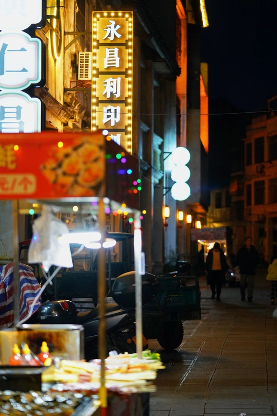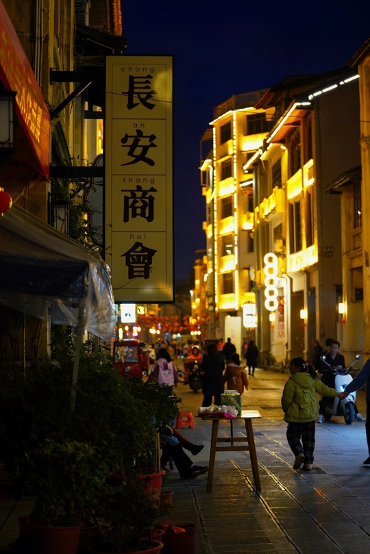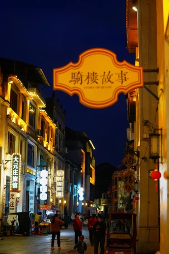 骑楼古镇,古韵悠长。 融安县长安镇设镇距今已有300多年历史,民国初期与广西的八步镇、怀远镇和容城镇齐名,有“四大名镇”之称。 得益于往来商贾的立足繁衍,长安镇形成了独特的街市——骑楼街。 整条街以砖木结构为主,又融合了欧式建筑艺术与岭南建筑文化,具有极高的艺术性与观赏性。 步入骑楼街,花窗、砖雕、牌坊、马头墙随处可见,还有罗马柱、山花、板花等欧洲古典风装饰物,中西合壁风貌独特。 白天街上人流拥挤,市场繁华;晚上灯火齐明,戏院(桂剧、粤剧)锣鼓叮咚作响,茶楼酒馆猜拳打码闹声阵阵……喝酒、品茶、听曲、谈生意者通宵达旦。长安古镇骑楼街夜景 ,相较于白天的长安古镇,夜晚的骑楼街就要来得更热闹些了。充满烟火气息的滤粉店、夜宵摊也让骑楼街多了些温暖的意味。