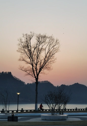 夕阳西下,路灯刚亮,一抹拿辉映着树,人,灯。显得静谧,温暖。