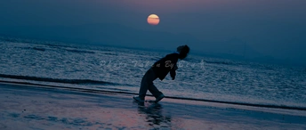 太阳即将落下。 蓝调时刻的海边, 一瞬。
