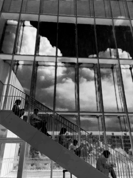 假日的图书馆格外热闹,台阶上看书的人们互不干扰。明亮的玻璃下形成了一道动静的对比