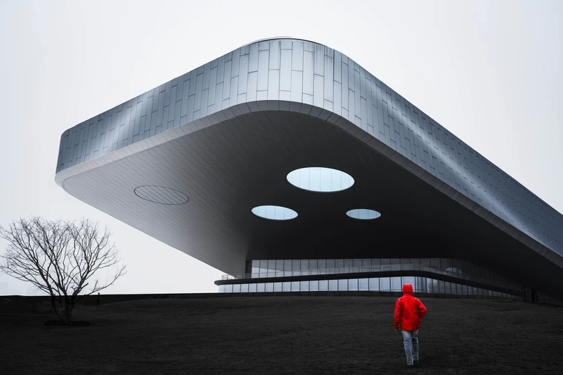 照片拍摄于西安长安云,外形酷似手机造型。 处理成明度建筑效果,凸显建筑的金属质感,红色的人物,点缀画面。